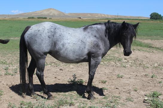 Blue Roan Mare with a left hind white. DOB: May 7, 2021 AQHA # 6082606